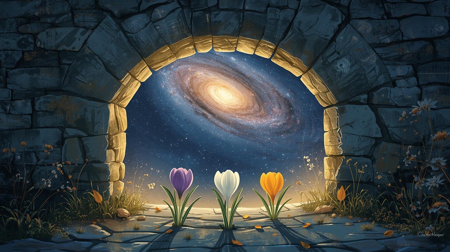 We’ve journeyed through Samhain’s descent into darkness, rested in Yule’s deepest stillness, and now stand at Imbolc’s threshold preparing to emerge. At this stage in our exploration we shift our attention outward, beyond the immediate needs of Body, Community and Planet and place our work within the larger stream of deep time. At this moment of preparation how do we align our work with the cosmic and ecological cycles that reach back into the distant past and forward into the distant future, without becoming lost in vastness?